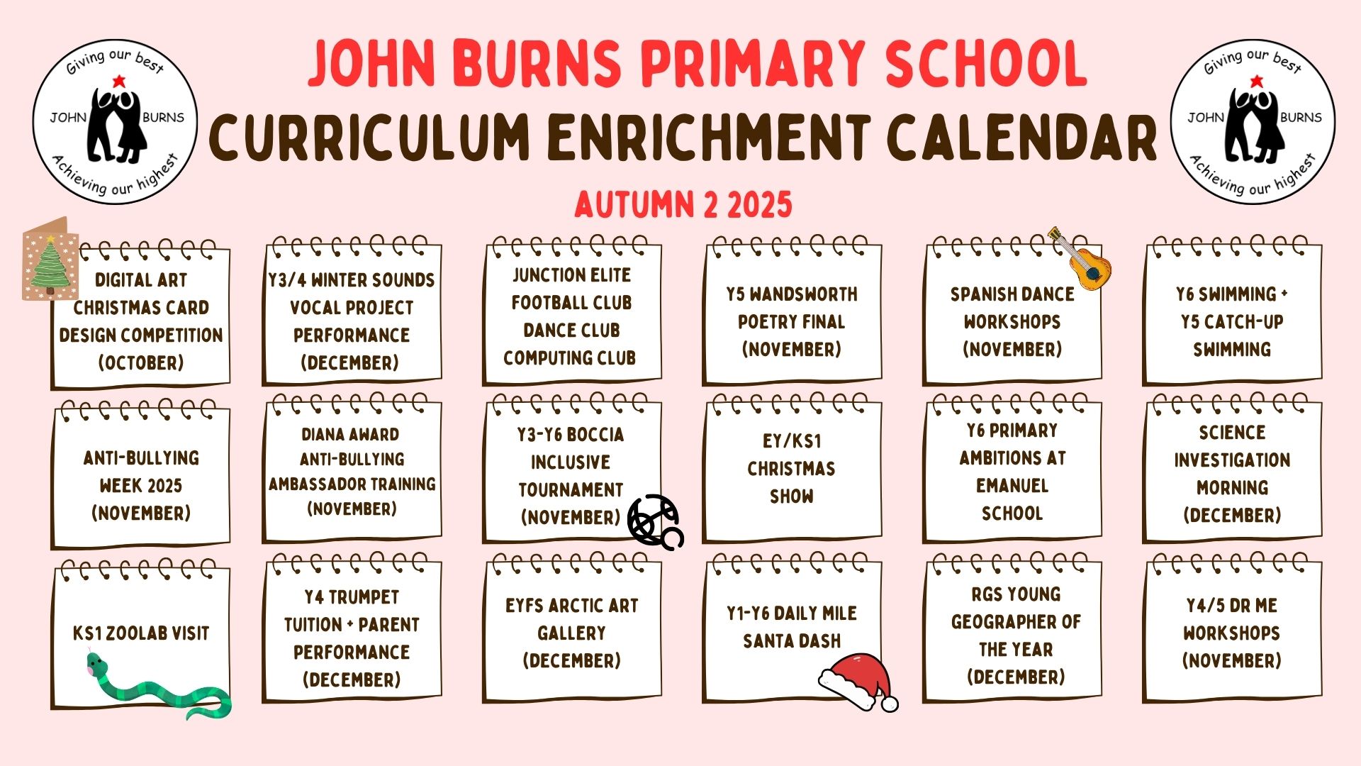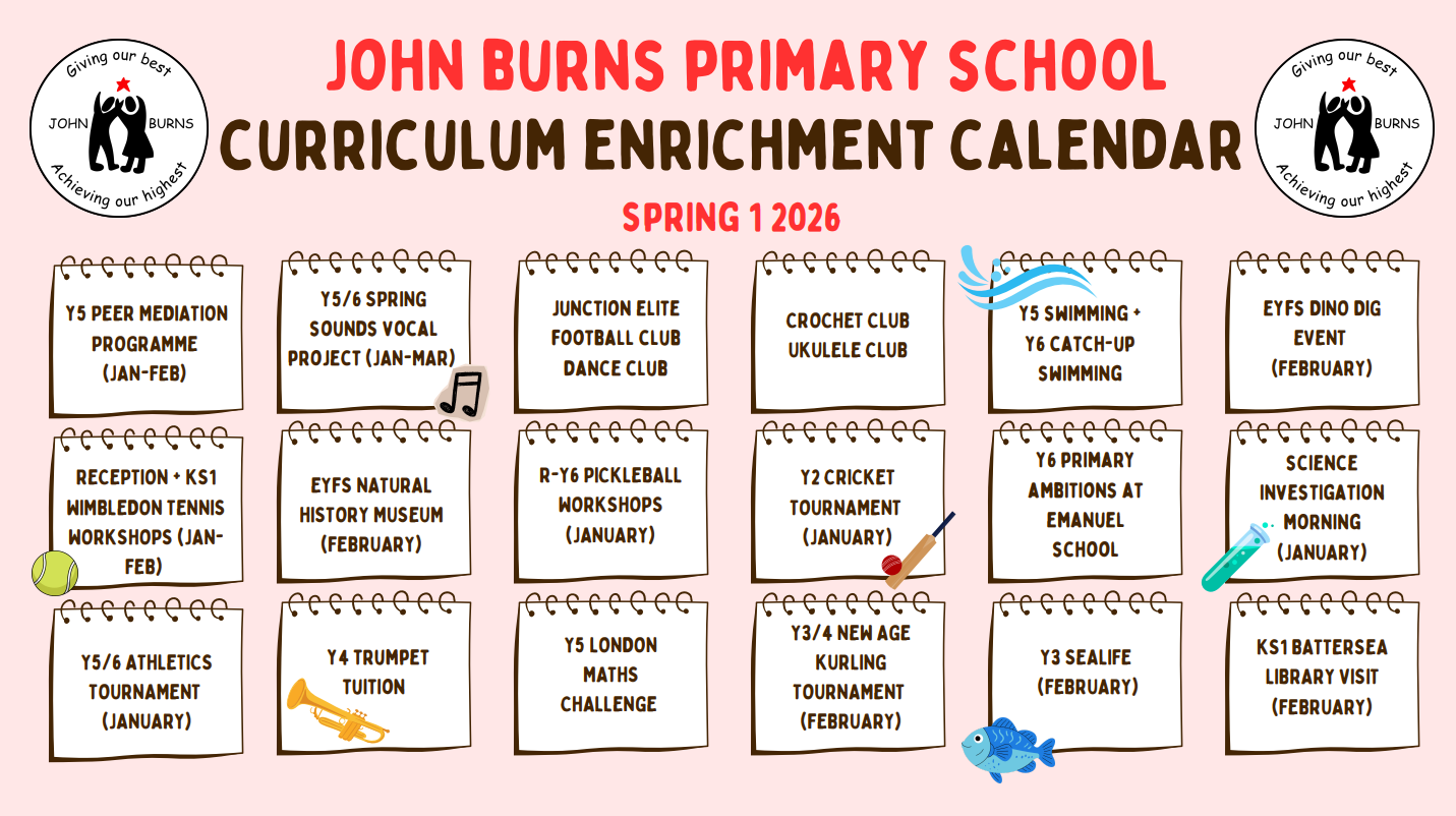 At John Burns Primary School, we are proud to offer a rich and varied programme of curriculum enrichment opportunities that enhance and extend learning beyond the classroom. These experiences are carefully planned to support our curriculum, develop pupils’ talents, and inspire curiosity, confidence, and creativity.