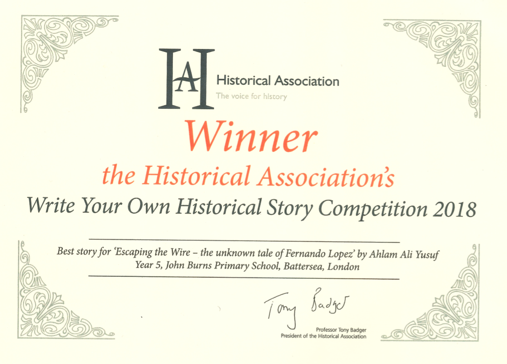 The Write Your Own Historical Fiction competition encourages young people to write their own fiction within a historical setting of their choice. The competition helps pupils to develop knowledge of a specific time period and to demonstrate knowledge of a specific time period and to demonstrate understanding through their own interpretations. 120 entries were judged by an expert panel and Ahlam Ali Yusuf's entry, ' Escaping the Wire - the Unknown Tale of Fernando Lopez' was judged 'Best Story' for the Year 5/6 category.